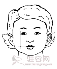设计酒窝的标准位置应该在由口角向外画的水平线和由外龇向下划的垂直线的交叉点上。