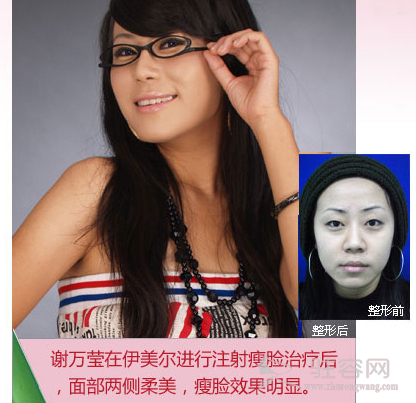 【专家点评】谢万莹的脸型和五官都比较匀称,从正面看其脸型、鼻型的轮廓与金泰熙略微接近,只是两侧的颊脂垫显得脸的下部比较宽,通过注射瘦脸,脸部线条即可美丽。她是单眼皮,眼袋也比较重,通过双眼皮手术和祛眼袋的方法就能使她的眼睛变得漂亮而充满阳光和朝气,这点恐怕更胜于金泰熙。她的鼻梁低、鼻翼宽、鼻尖短,通过综合鼻整形手术,使其脸型与五官搭配得更具有女性的柔美。谢万莹的肤色暗沉发黄,面部毛发较重,一般的皮肤护理无法解决,通过面部脱毛、彩光嫩肤等非手术治疗,改善其面部肤色不均匀、无光泽的问题,让其更具有弹性。